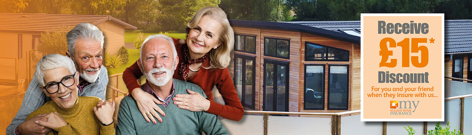 For every friend you refer to My Holiday Home Insurance who goes on to take out a new policy with us, for a holiday lodge, static caravan, UK holiday home, UK holiday chalet, touring caravan or European holiday home, you’ll receive £15 off your insurance policy and they’ll receive £15 off their first year’s premium too. There is no limit to the number of friends you can refer to us. So, the more friends you introduce to us, the lower your insurance premium will be next time you renew your policy. Each time you make an introduction and they take out one of our policies, you and they receive a £15 discount on your premiums.